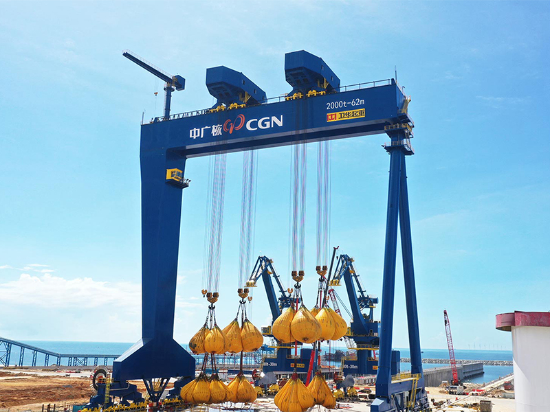 憑借行業領軍的研發實力及創新能力,針對項目復雜的工況要求,衛華現已研制出2000t軌道式龍門起重機,其起升總高度達90m,跨度達62m,采用雙小車設計,并在生產制造環節采用AWS標準,可保障在極端情況下將吊裝重物安全降至地面,實現各機構零速制動,使沖擊造成的載荷降為零,保證運行機構、起升機構的平穩性,滿足設備安裝精度的要求。