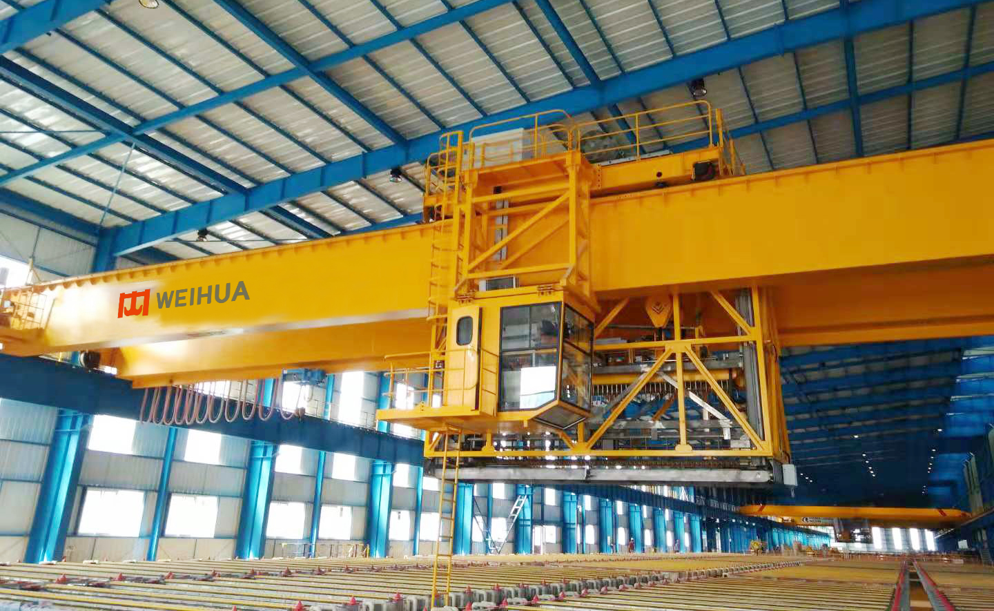 電解銅專用起重機是針對電解銅的生產(chǎn)工藝要求而設(shè)置的一種專用起重機。其主要功能是將已經(jīng)排列好的陰陽極板從排距機組上取下,吊運至空槽處,安裝在電解槽中,即裝槽;電解完成后,將陰極板取出并運至洗滌機組;將消耗殆盡的殘極板(即陽極板)從電解槽中取出并送往洗滌機組。